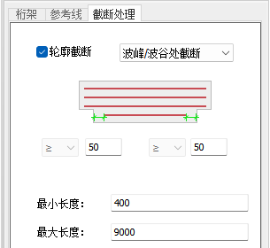勾选【轮廓截断】时,可根据轮廓形状对桁架进行截断,设置桁架起始点缩进距离最大值。