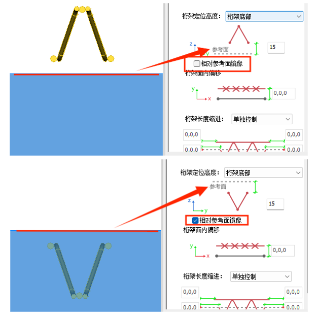 勾选【相对参考面镜像】,桁架将以参考面为轴线进行镜像位置桁架的布置。