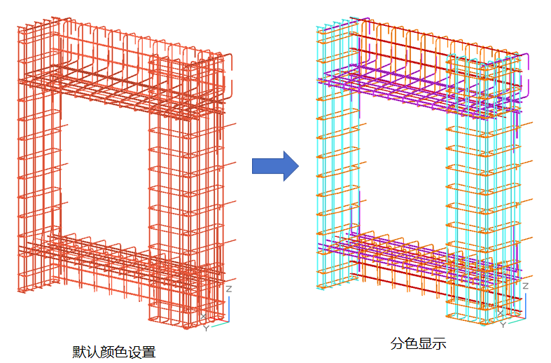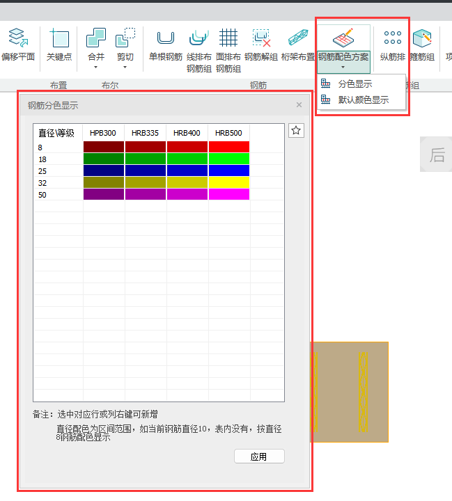 可对不同的钢筋直径与钢筋等级可以设置不同的颜色显示,直径配色为区间范围,若钢筋直径在区间范围内,按范围最小直径钢筋配色显示。如钢筋直径为10,表内没有对应直径,按钢筋直径8配色显示,效果图如下。