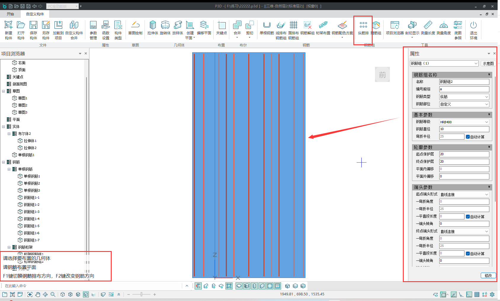 点击【纵筋排】按钮,程序界面左下角有操作步骤的提示。选中钢筋所在的几何体,选择平面,在此平面上进行纵筋排的绘制。注意该平面为后续参数如“平面内偏移”和“平面外偏移”中的参考平面。