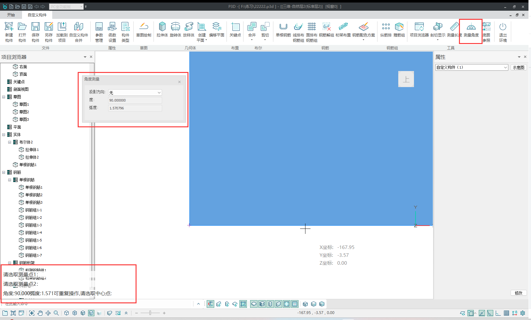 点击【测量角度】弹出如图所示对话框,选择【投影方向】后根据命令提示进行角度和弧度的测量。