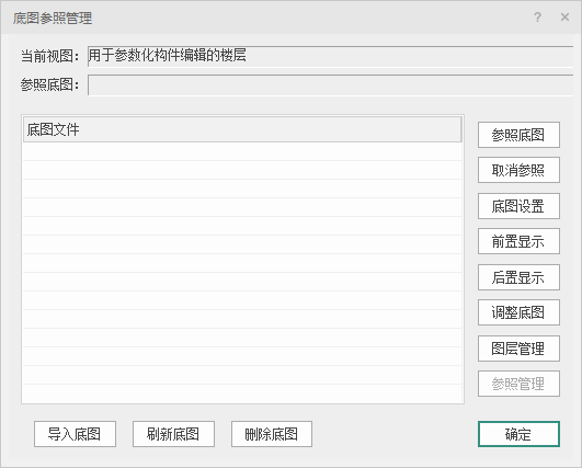 导入底图后可对底图进行【参照底图】、【取消参照】、【底图设置】、【前置显示】、【后置显示】、【调整底图】、【图层管理】、【参照管理】等设置。