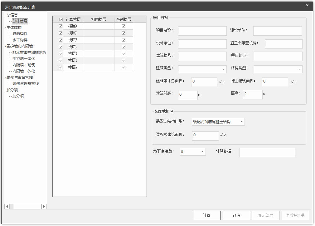 用户可在总信息中选择所需计算的楼层以及项目基础信息,此处同7.1.2国标装配率章节,启动界面如下: