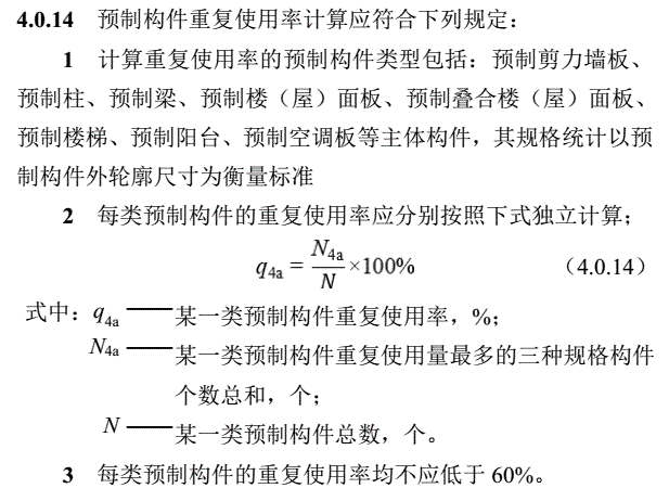 由程序统计全楼重复使用量最多的三种构件规格的总个数比该类构件总数。每类预制构件的重复使用率均不应低于60%。当重复使用率大于等于60%时,可得3分。