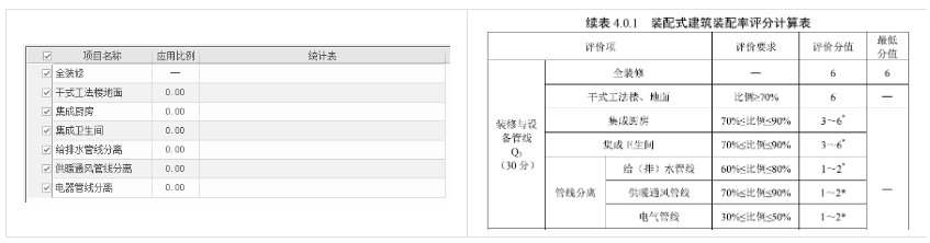 此项包括装修和设备管线的应用占比,默认勾选全装修选项。其余各项采用手动输入应用占比,数值填写范围0.00-1.00。也可补充插入EXCEL表格到报告书中。程序界面和评分标准如下图所示: