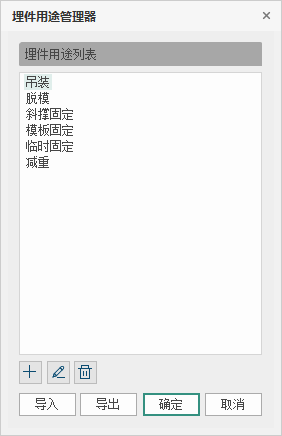 管理埋件用途,支持埋件用途的管理、重命名、删除及埋件用途库的导入导出。