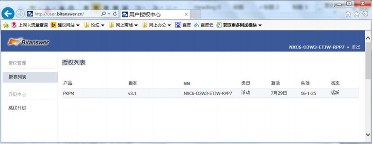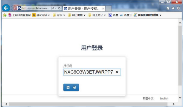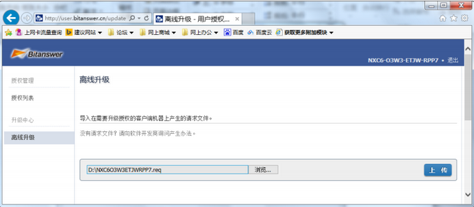 请求文件产生后,需要拷贝到一台能联网的机器,然后登录用户授权中心上传请求文件以获得升级文件。用户授权中心的网址是:http://user.bitanswer.cn/,需要输入授权码进行登录。
