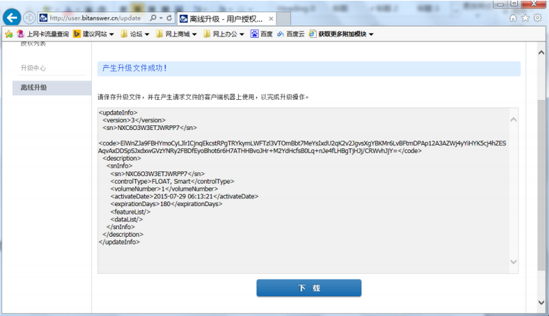 上传离线升级文件后,如果升级成功,会给出提示,并提供下载升级文件。