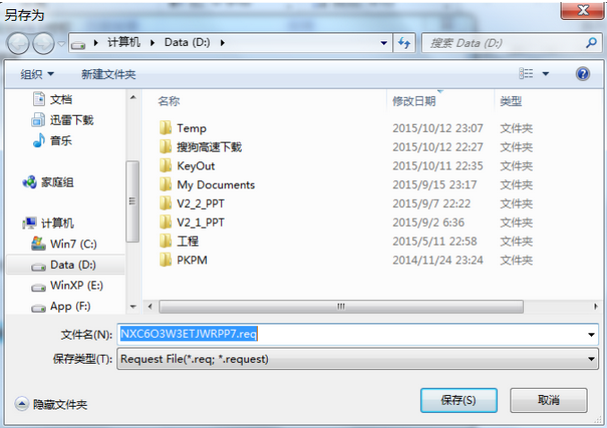 选择离线操作方式后,首先要产生包含机器硬件指纹的请求文件。请求文件产生后,需要拷贝到一台能联网的机器,然后登录用户授权中心,提交请求文件并获得升级文件。点取“产生请求码”,会产生请求文件,请求文件为“授权码号.req”