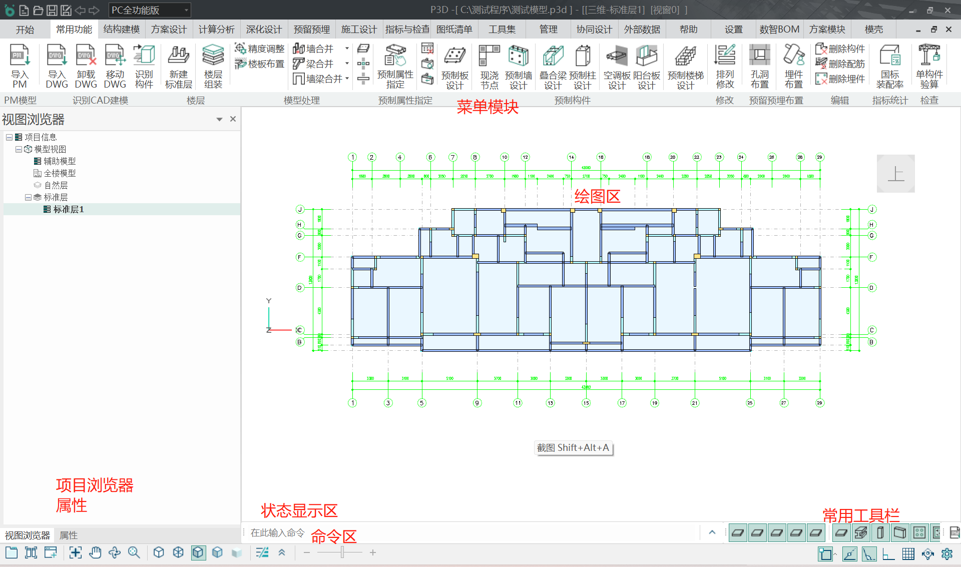 程序界面分为五个区域,上部为快速访问工具栏和Ribbon菜单,中部左侧为项目浏览器和属性窗口,中部为绘图区,下部为常用工具栏、命令区和状态显示区。