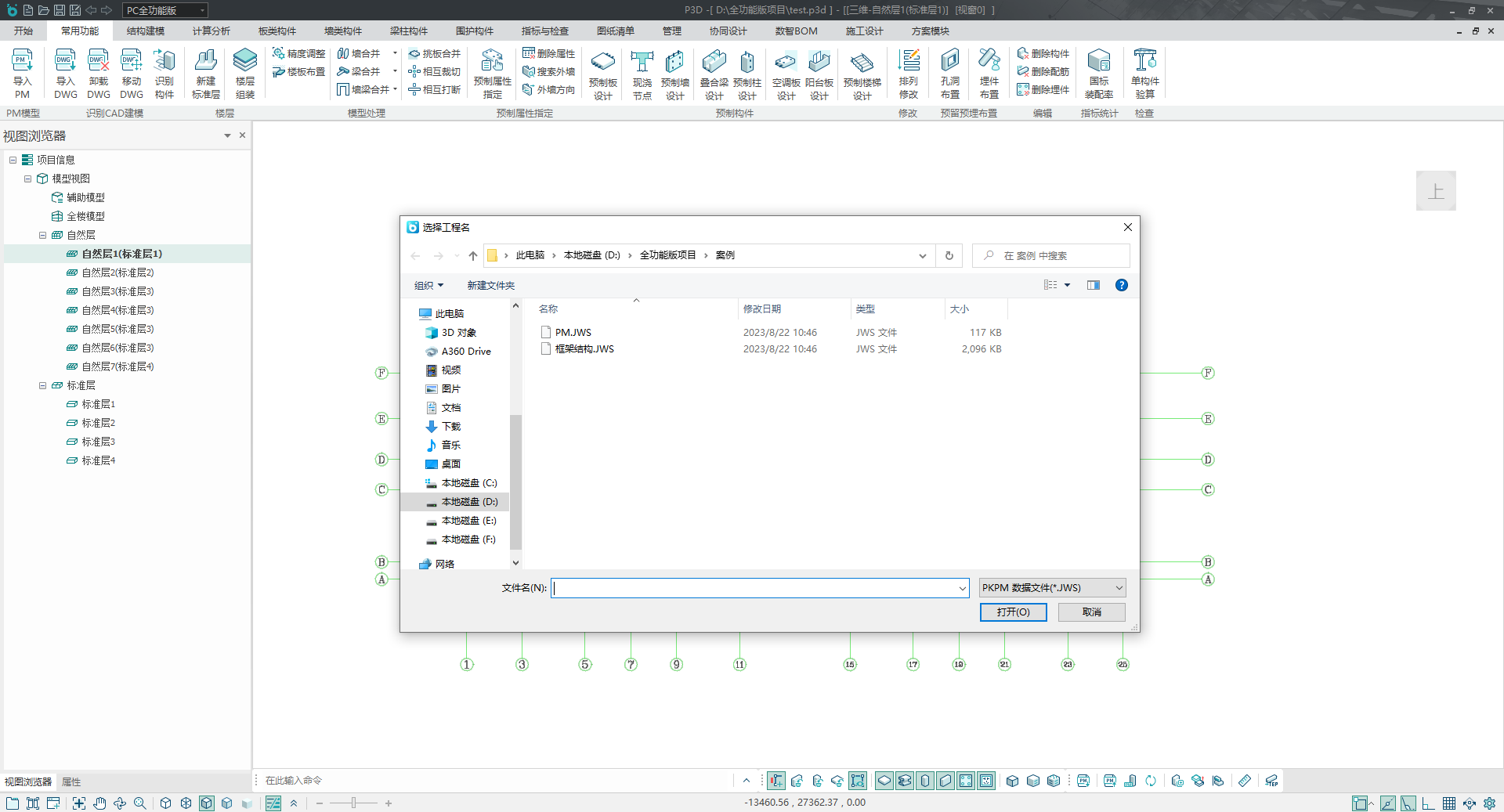 点击“导入PM”,在弹出的对话框选择.jws文件,点击“打开”,将PKPM的结构模型导入到PKPM-PC模块中,如下图所示。