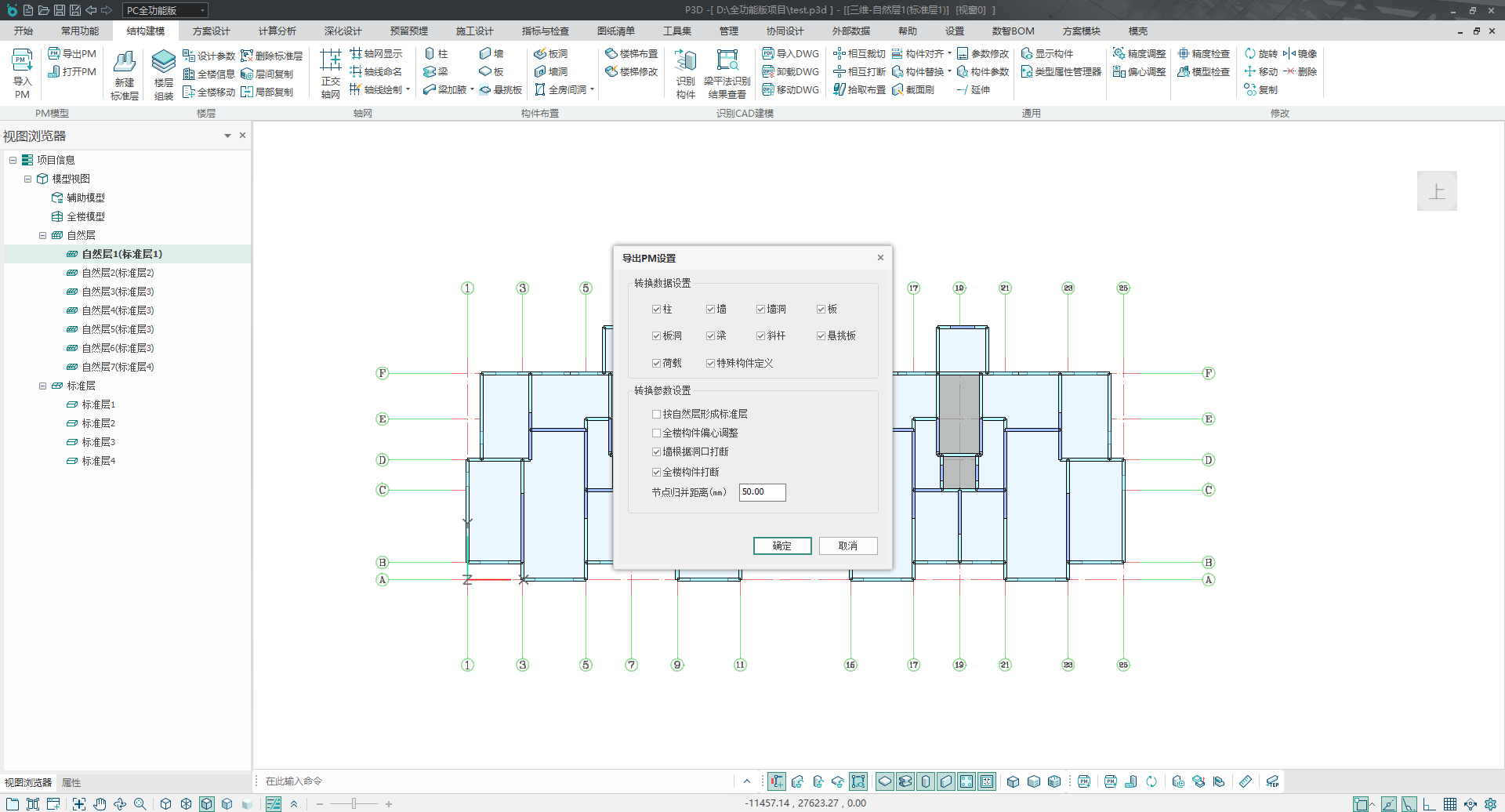 点击“导出PM”,在弹出的对话框点击“确定”,将PKPM-PC的模型导出成PM模型,并且可以通过勾选“导出完成后打开PKPM”,实现PKPM-PC与PKPM之间的模型数据接力,如下图所示。
