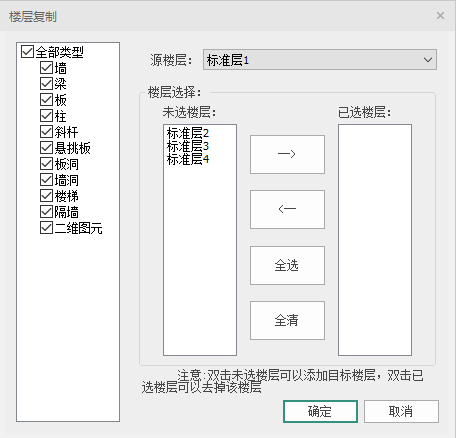 在对话框左侧,用户可以复制的构件类型,目前支持:墙、梁、板、柱、斜杆、悬挑板、板洞、墙洞、楼梯、隔墙、二维图元。在右侧可以选择源楼层和目标楼层,用户可以双击增加或减选标准层,点击【确定】复制。注意:墙洞、板洞的复制依赖于墙构件和板构件,比如对于带墙洞的墙,若仅复制墙洞,则会复制不成功。