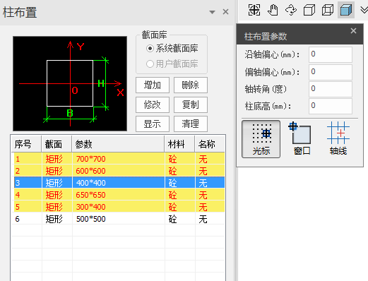 柱的截面管理工具有:增加、删除、修改、复制、显示、清理。