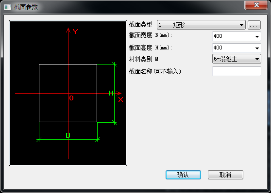 - 截面库目前仅支持系统截面库,点击【增加】按钮,弹出柱截面定义的对话框,如图所示,要求定义柱的截面形状类型、尺寸及材料,截面名称可不输入。