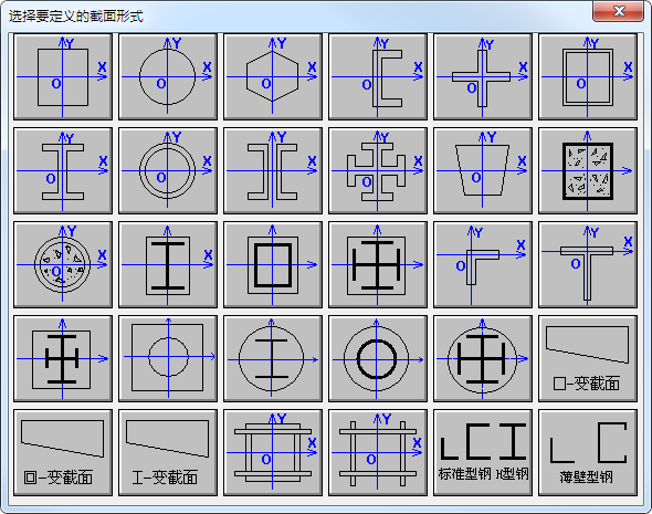 如果需要更改截面类型,点【截面类型】右侧的…按钮,弹出截面类型选择对话框,如图所示,选择相应的截面类型即可。