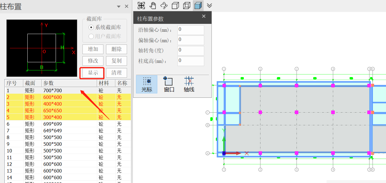 - 选中截面列表中某一种截面类型,再点击【显示】按钮,则当前视口中基于该截面布置的柱构件将会高亮显示,如图所示。