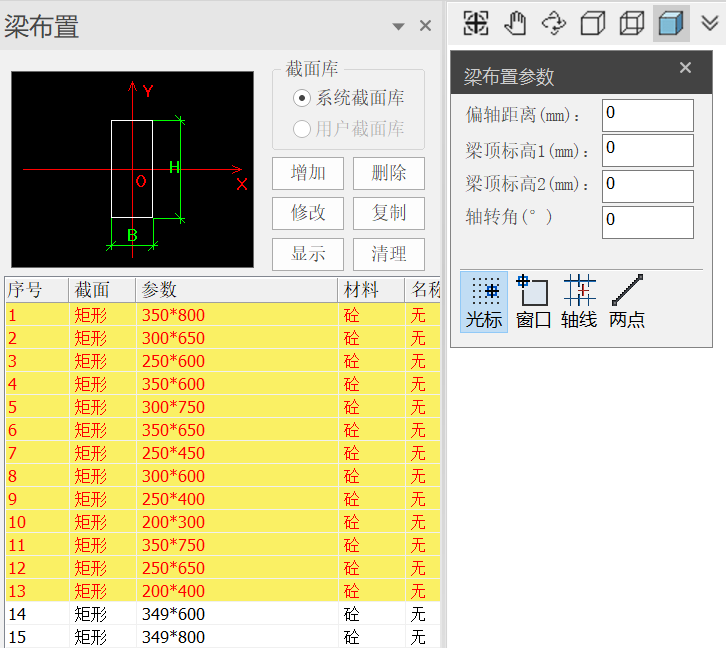 用鼠标在梁截面定义列表中点取一种梁截面后,移动鼠标到平面上需要的位置,选择光标、轴线、窗口、两点方式完成梁构件的布置。如果该梁存在偏轴距离,梁顶标高1,梁顶标高2,轴转角,可同时在屏幕上的梁布置参数框中填写相应的参数值。