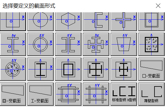 梁的截面列表文字及底色显示,截面管理工具(增加、删除、修改、复制、显示、清理)同2.4.1节柱。注意:在增加中定义梁的截面类型与柱有一些差异,如图所示。