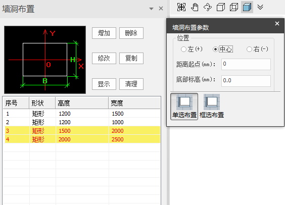 注意:墙洞的布置依附于墙构件,且一片墙上可以存在多个洞口,但是当洞口存在重叠时,后布置的洞口替换已存在的洞口。