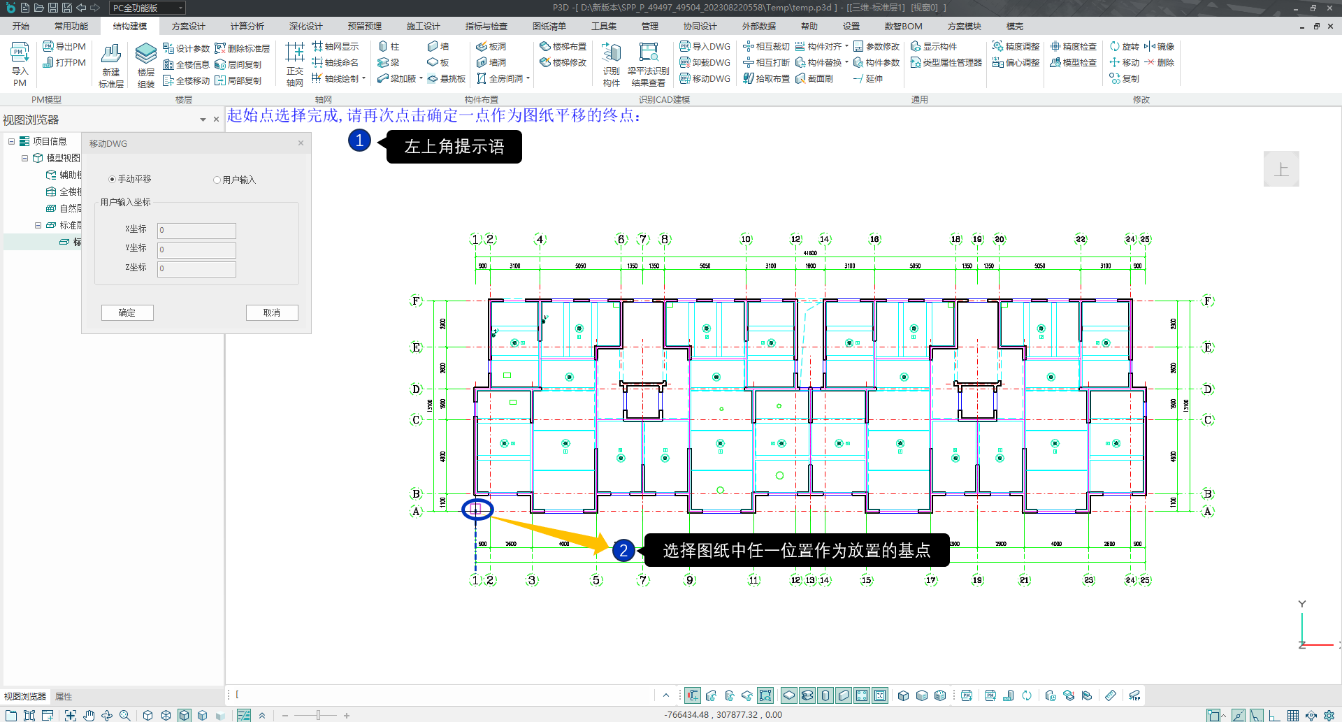 2)载入图纸后,按照左上提示语操作,选择图纸中的某一点作为图纸放置的基点,如图所示;然后确定基点放置的位置,有两种方法,一是选择输入一个坐标点,二是在屏幕工作区域指定位置放置,如图所示;完成导入。