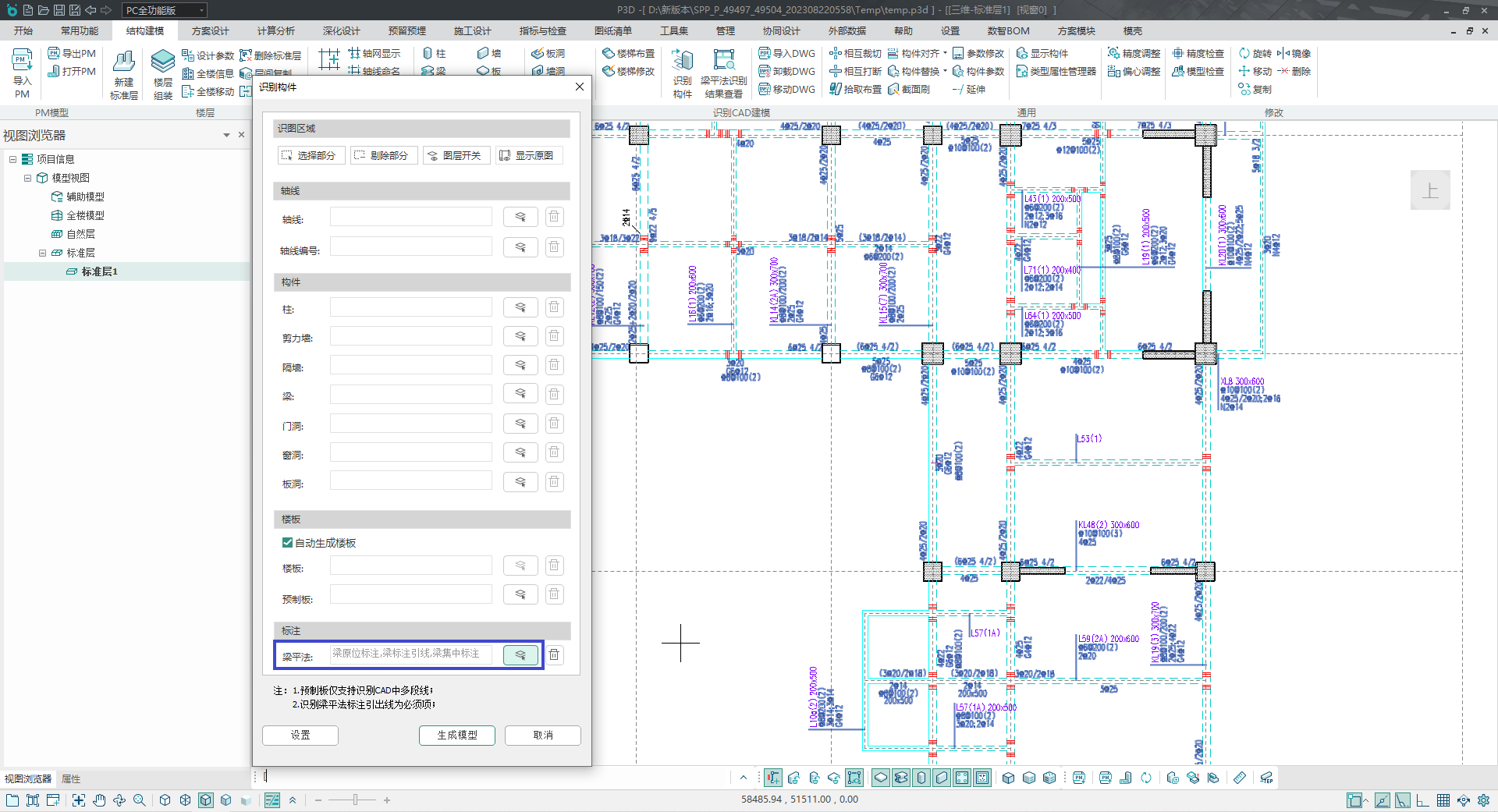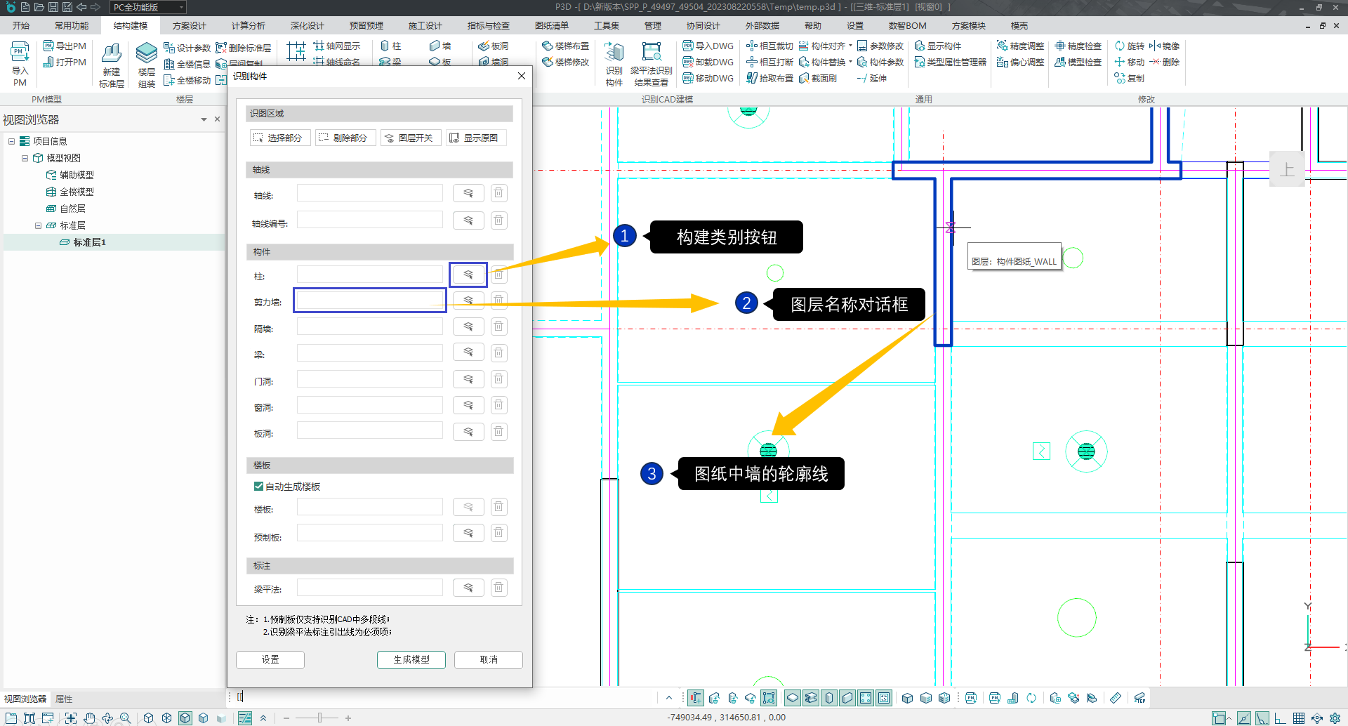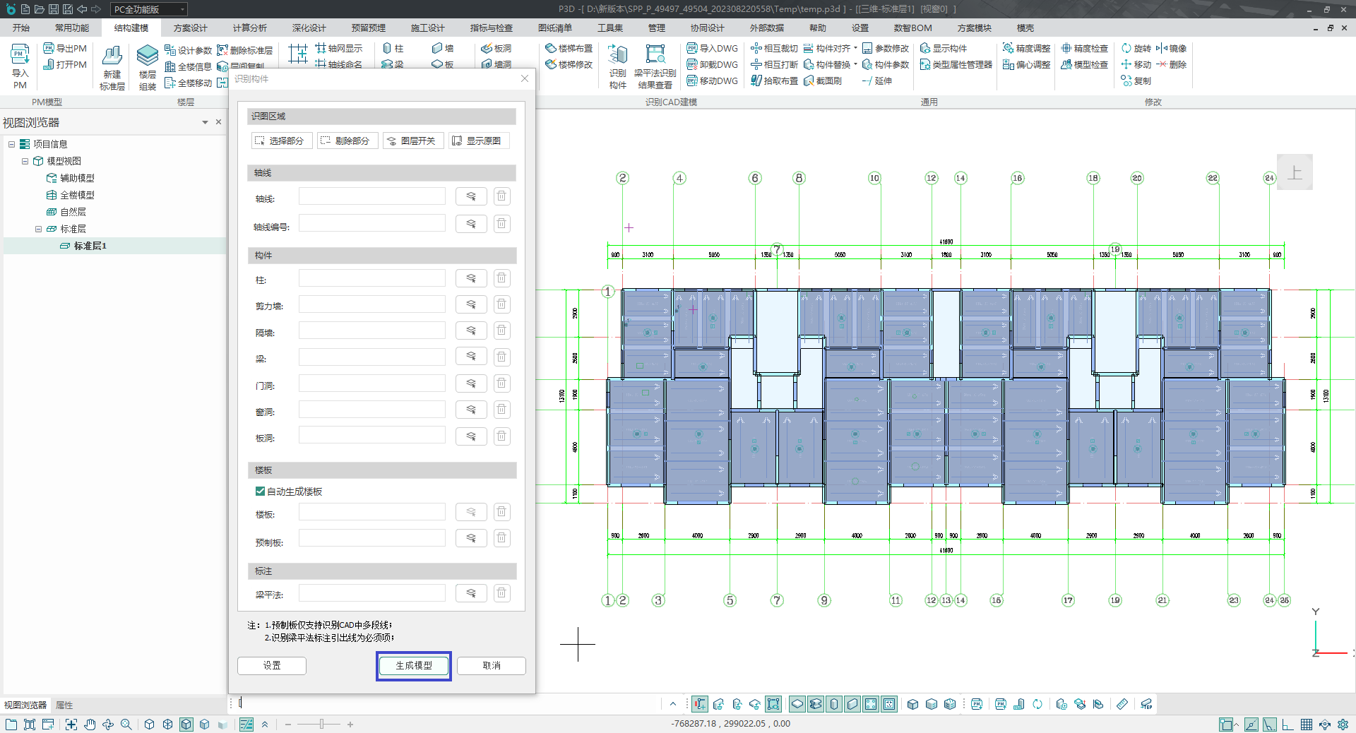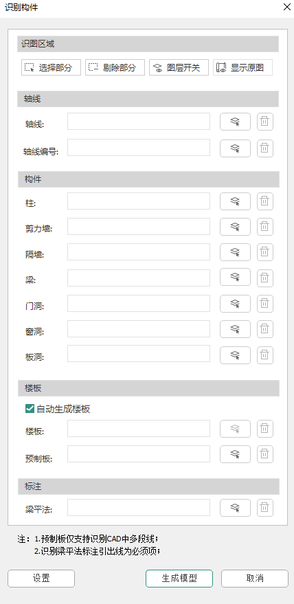 用户使用该功能,可以识别图纸的特定图层完成相应构件的建模。