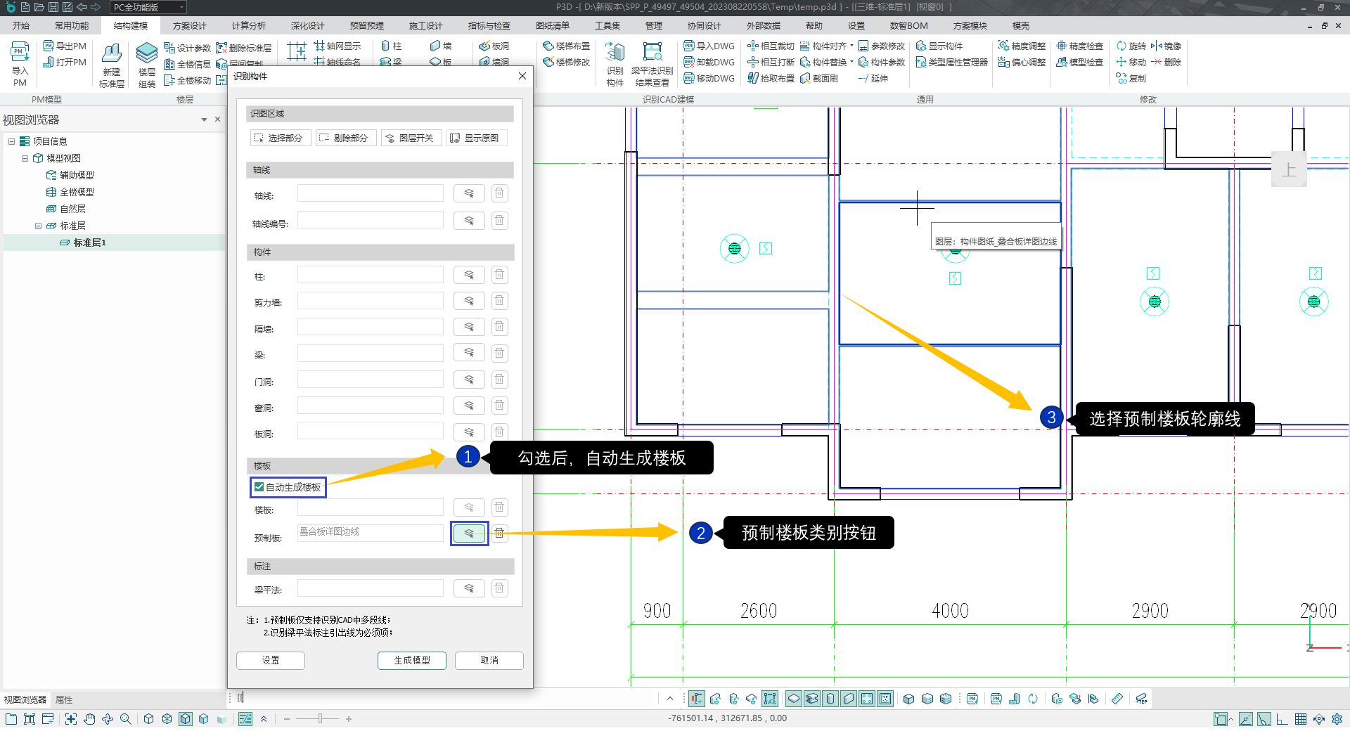 3) 当勾选“自动生成楼板”,程序会根据生成的模型自动生成楼板。点击“预制楼板”按钮,选择预制楼板轮廓线,右键确认。需要注意的是,预制楼板模型生成的前提是必须有结构楼板,如图所示;