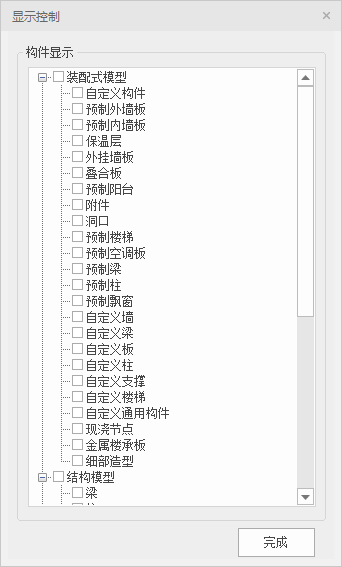 显示构件用于控制需要显示的构件类别。可选择显示或隐藏装配式模型(如叠合板)、结构模型(如梁柱墙)和设计模型(如节点、墙梁)。