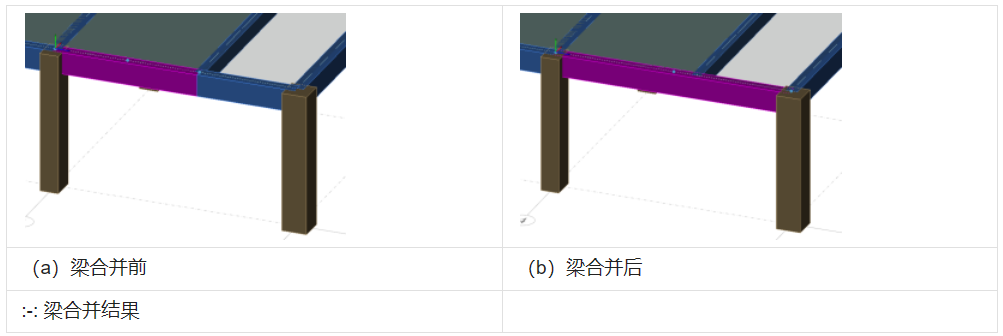 执行“梁合并”命令,选择需要合并的梁可将多段同一直线上截面相同且完全相接的梁合并为一段,如下图所示。