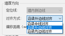 “定位线”为当选用“两点”、“框选”、“轴选”、“单轴”等隔墙布置方式时此参数生效,可选“墙中心线”、“墙外侧边线”或“墙内侧边线”与选择的两点连线或轴线对齐;除“两点”布置模式外,其他布置模式支持预览布置过程中Tab键快捷切换定位线选项;