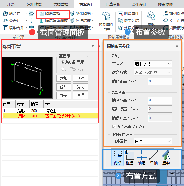 点击【隔墙建模】,程序界面左侧弹出对话框如下图所示。界面中,区域①为隔墙界面管理面板,区域②为墙布置参数面板,区域③为墙布置方式选择面板。