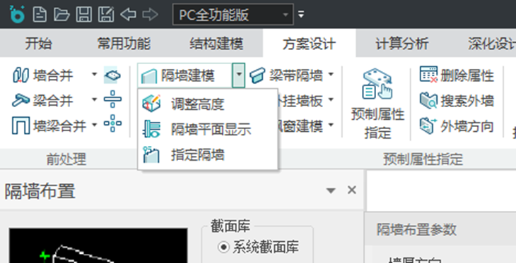 【隔墙建模】功能支持布置混凝土、砌体、轻质材料等不同材料类型的梁下或板下隔墙。有调整高度,隔墙平面显示,指定隔墙功能。