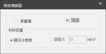 点击【指定隔墙】命令,弹出如下图所示的对话框,使用该功能可以调整墙体的“承重”与“非承重”属性以及材料容重。