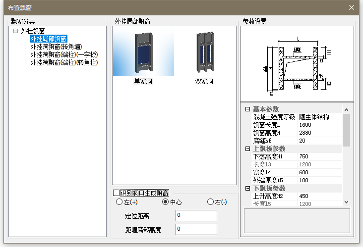 外挂局部飘窗包括基本参数、上飘板参数、下飘板参数、左侧板参数、中侧板参数(对于双窗洞)、右侧板参数、背板参数等飘窗外形信息参数设置;