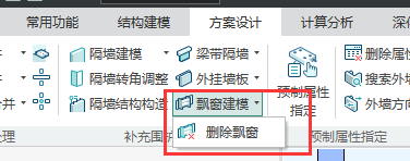 点击【飘窗建模】右侧小三角,点击下拉框中的【删除飘窗】功能,进入删除飘窗状态,在程序中点选或框选飘窗,即可完成飘窗删除操作。之后可使用esc或者空白处点击鼠标右键退出飘窗删除状态。