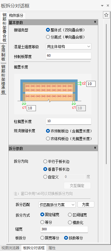 接缝长度类型分【齐预制板边(含搁置长度)】和【齐结构板边(无搁置长度)】两类。拆分参数