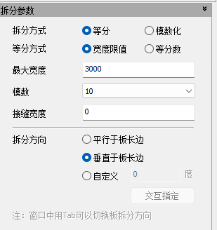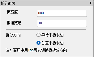 【拆分方向】提供【平行于板长边】和【垂直于板长边】两个方向,在拆分时按Tab键可以在两个选项间切换。构造参数