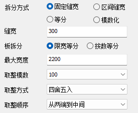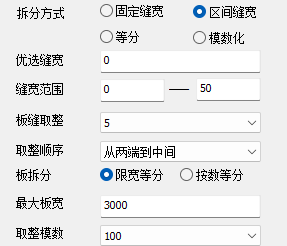【板宽度】为拆分的基准板宽度尺寸,当板依次排列余值不足以放置一块基准板时,用≤基准板宽度的板补充。