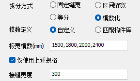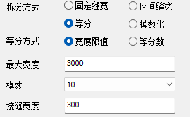 【限宽等分】:在保证预制板宽度尺寸不大于【最大宽度】的情况下,取最小拆分数作为等分数进行拆分。