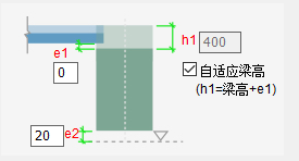 如下图所示,h1为现浇高度,e1为梁底到预制柱顶的接缝高度,e2为柱底到下层楼面的接缝高度。勾选【自适应梁高】时,程序将根据柱上最高的梁自动计算h1。