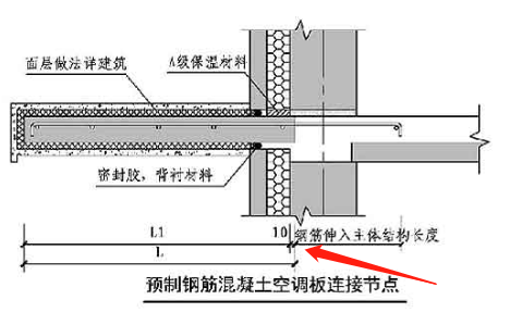 预制空调板伸入到结构墙边的距离,当外墙采用夹心保温三明治外墙时,此值为空调板深入到内叶墙板边缘的长度。如