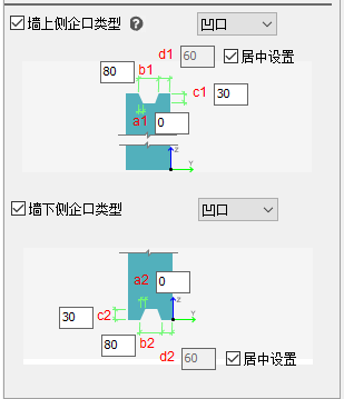 【设置上侧企口】选是时,可布置墙上侧企口,提供下拉菜单设置企口类型:【左侧企口】、【右侧企口】、【凹口】。