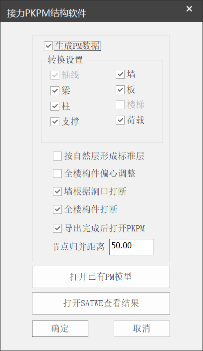 转换设置:当生成pm模型时,用户可以选择转化构件类型,主要包括:轴线、墙、梁、板、柱、支撑、楼梯、荷载。注意:轴网、楼梯为灰置状态,且不支持楼梯构件的转化。
