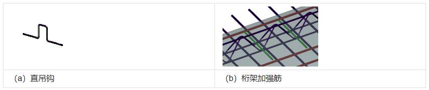 【吊装埋件类型】:提供【直吊钩】和【桁架吊点】两种类型。【直吊钩】:吊钩布置一般平行于钢筋网片的下层钢筋,底部平直段与另一方向的钢筋绑扎。底部平直段上皮与垂直方向钢筋下皮齐平。【桁架吊点】:以三角面片作为桁架吊点标记。当桁架下弦筋上方无贯穿钢筋时,需要在吊点处添加加强筋。加强筋一般放置在桁架波谷位置,加强筋下皮与桁架下弦筋上皮齐平,一组桁架加强筋为2根。