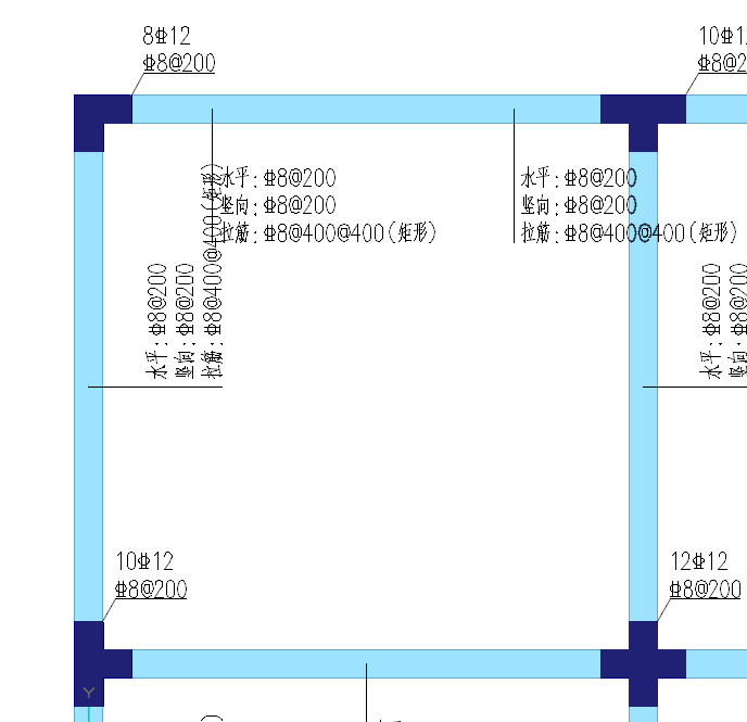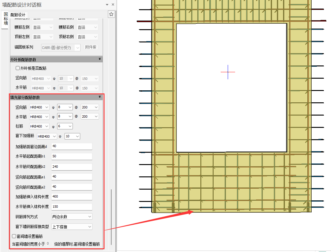 【竖向筋】/【水平筋】:可以设置填充部分墙体的竖向筋、水平筋配筋参数,包括钢筋强度等级、直径和间距。