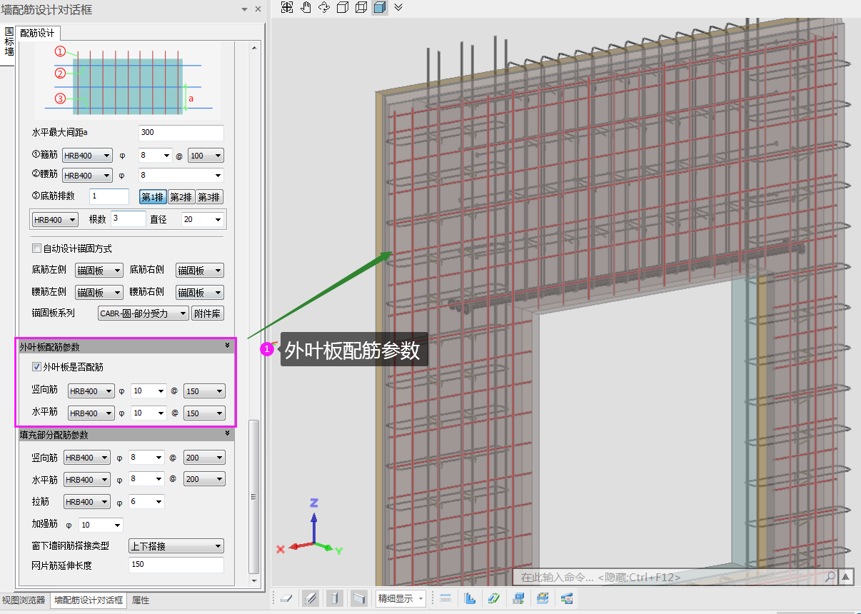 【外叶板是否配筋】:当勾选此项时,可以对外叶板的竖向筋和水平筋的钢筋强度、直径、间距进行参数设置,程序将根据设置的参数对选择的外墙板进行外叶板配筋。