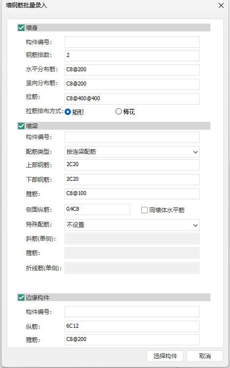 【按框架配筋】:对【左端支座筋】、【中间支座筋】、【右侧支座筋】、【附加箍筋】和【附加吊筋】的参数进行调整。墙配筋批量录入