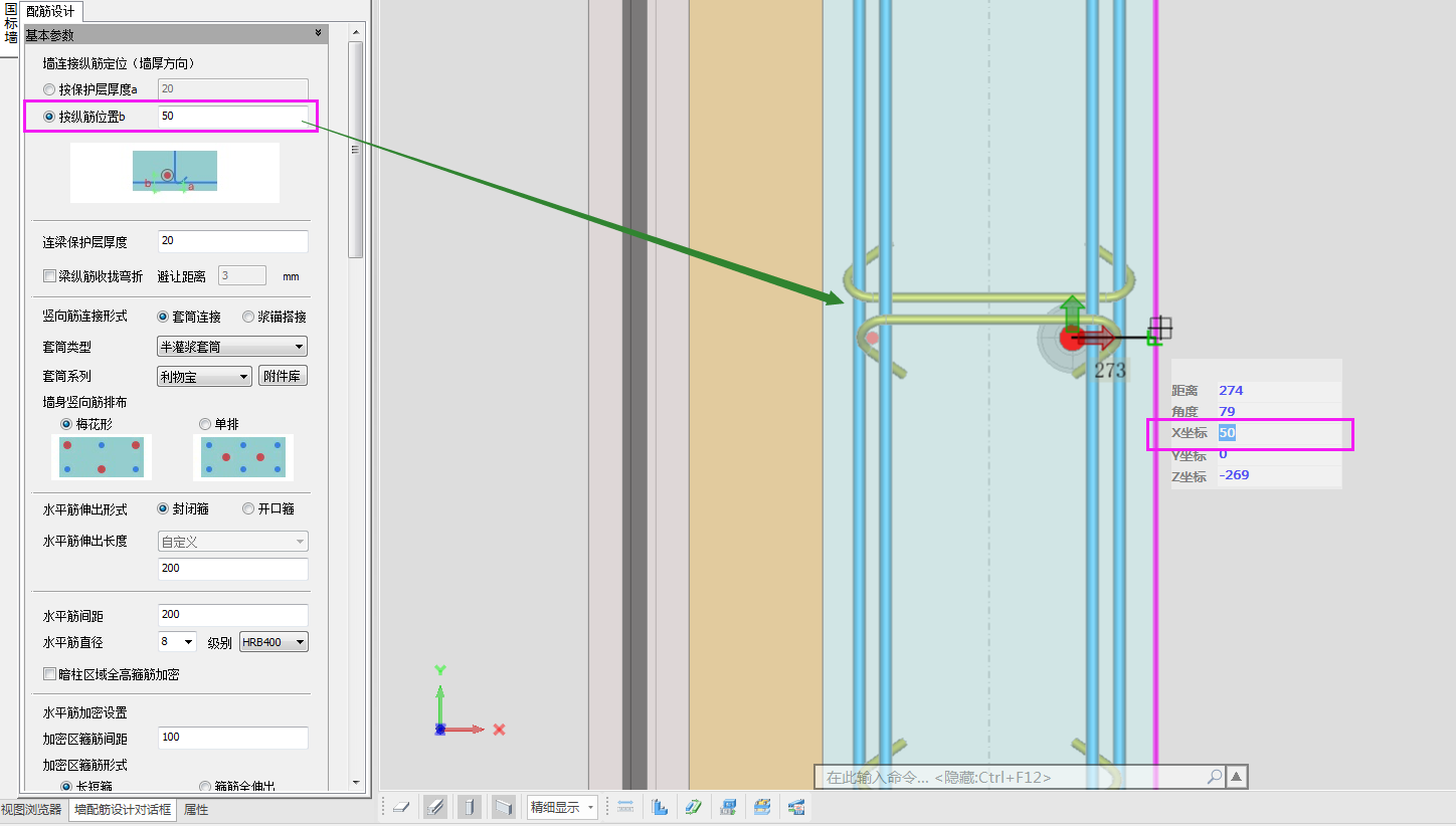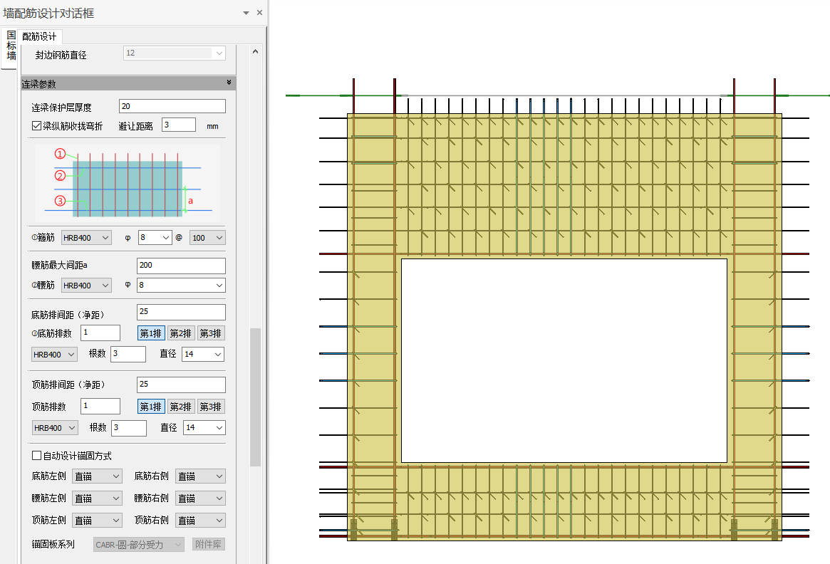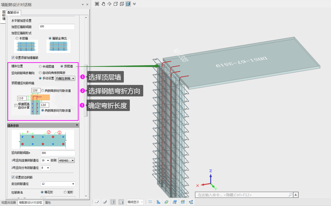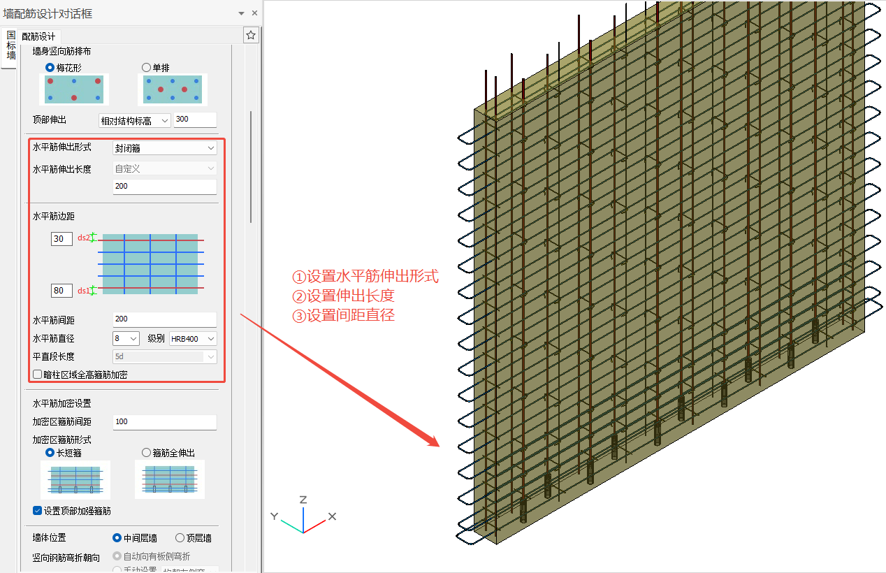 【读取界面参数】:按照配筋设计参数对生成剪力墙三维钢筋。