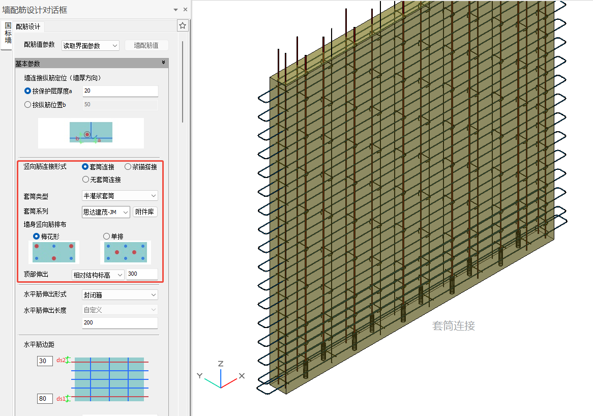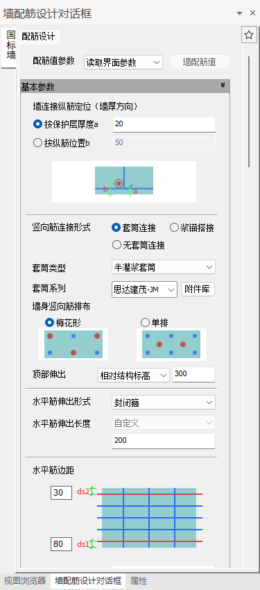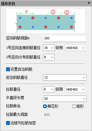 【墙身竖向筋排布】:可以选择【梅花形】与【单排】两种形式的连接。