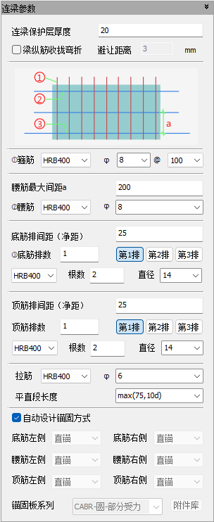 【自动设计锚固方式】:当勾选此项时,程序将自动进行连梁锚固方式的设计。当不勾选此项时,可手动选择底筋左右侧、腰筋左右侧和顶筋左右侧的锚固方式,锚固方式包括直锚、直角弯头和锚固板三种。
